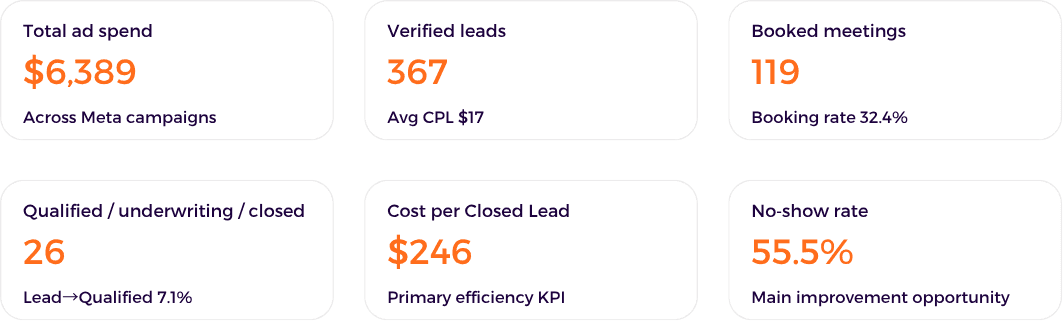 The data made it clear the biggest limiter wasn’t lead cost—it was attendance, with no-show rates frequently landing around 55–63%. We responded by implementing stronger form qualification, improving follow-up sequencing, and adding tracking for bad numbers and not interested so the system could keep improving.